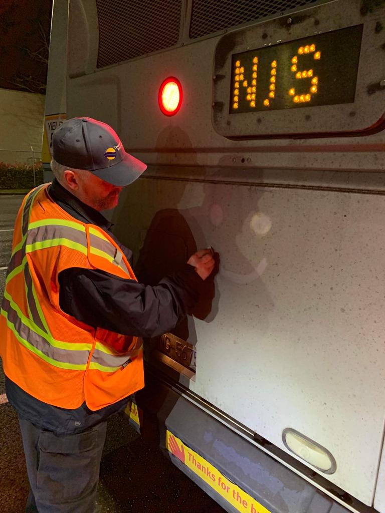 a fellow bus driver who was sent to me by God to help me through my final weeks. He started my bus for me each morning, and I would write a smiley face on the back of his bus, something I did for a prank one of the first days of the sheet.