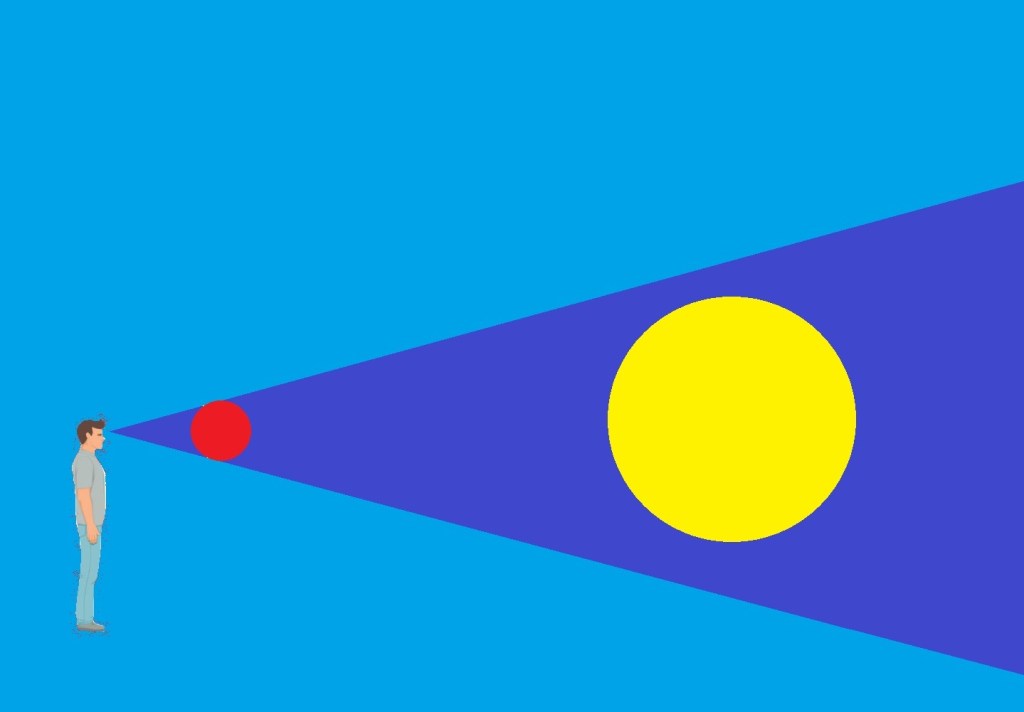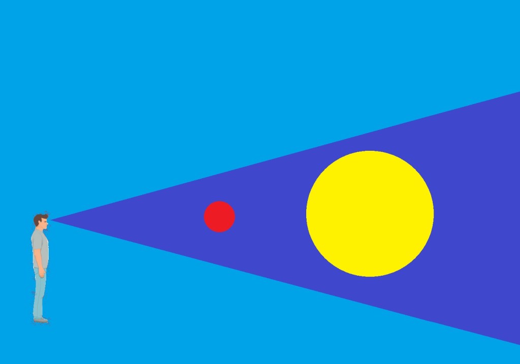 You can see in that first illustration that the SUN and the problem (the red dodgeball there) when compared objectively, can be seen in their true perspective. The man standing there I’ve drawn your attention to his field of vision, its the darker blue there.