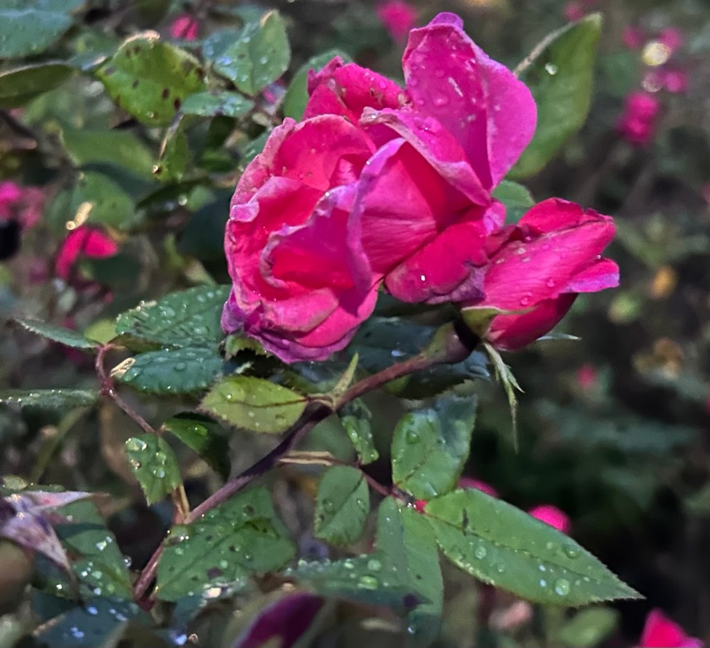 There’s this Rose bush I park beside each morning. It’s a chaotic set of brambles.
