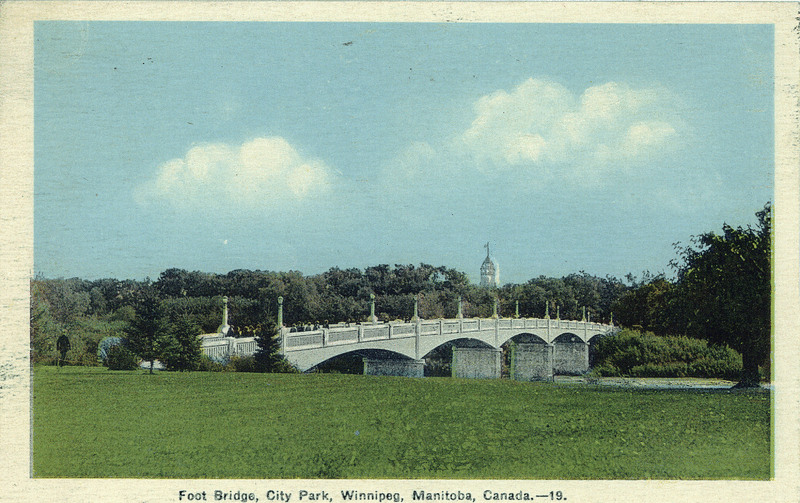 In May 1932 this handsome footbridge was officially opened by Winnipeg Mayor Ralph Webb. Like the Norwood and Main Street bridges, the Winnipeg Auditorium and the Salter street viaduct, the Assiniboine Park Footbridge was partially erected as a Depression relief effort.