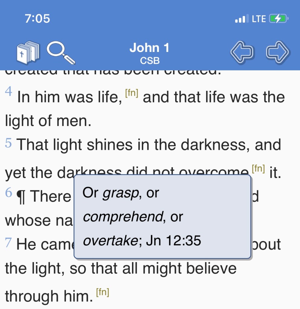 5 And the light shineth in the darkness; and the darkness apprehended [a] it not.