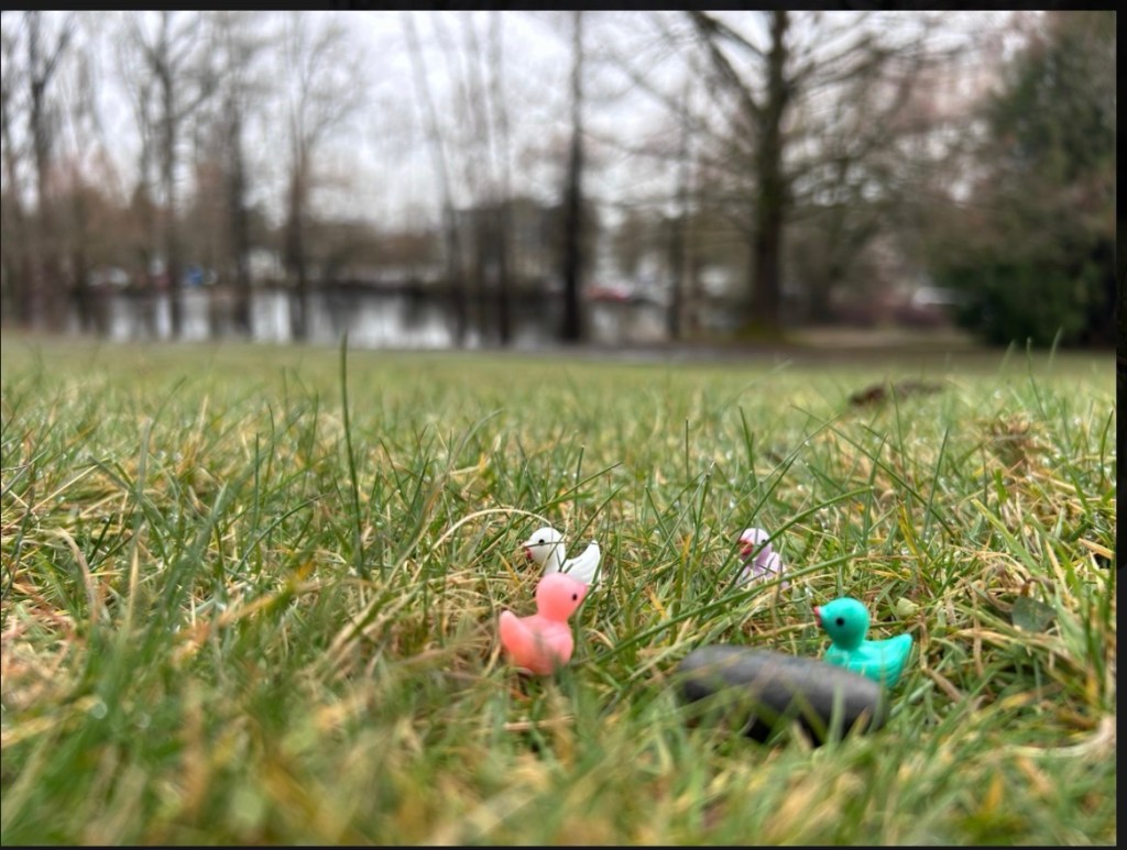 What you’re seeing in the grass are tiny toy ducks—the kind often called “mini resin ducks” or “micro rubber ducks.”People sometimes scatter them in parks as part of small games or little acts of whimsy.