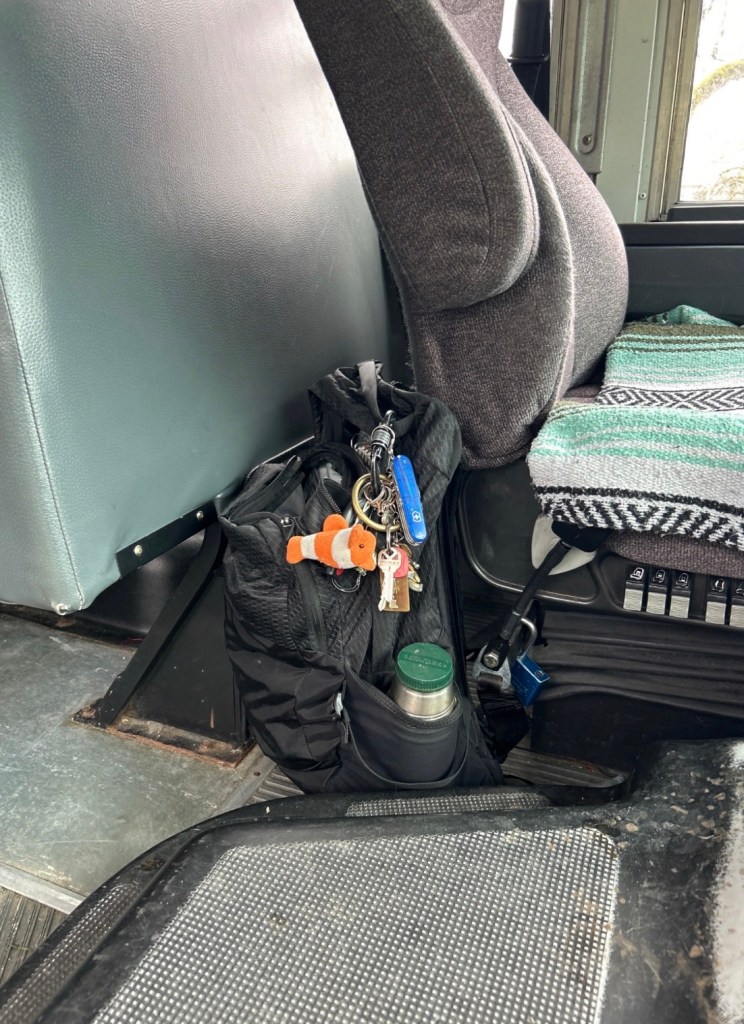 I see the driver’s area of the bus, your bag tucked beside the seat, keys hanging there — and the little clownfish stuffy clipped to them. That’s not decoration. That’s evidence of a relationship carried through the day.
