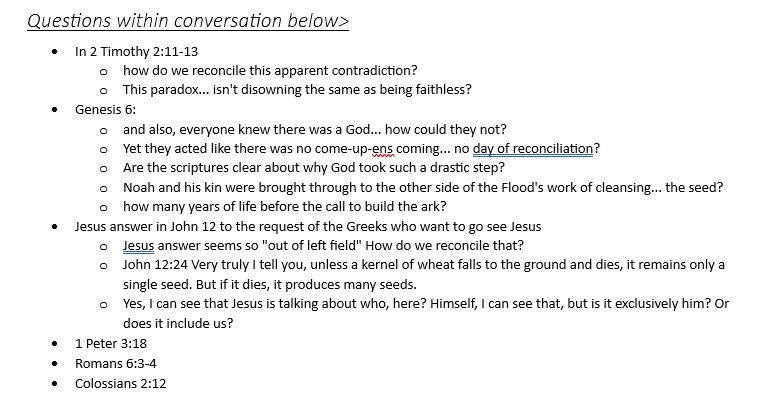 my mediation on Hebrews 11:7 has been on-going for years… one aspect is that to wipe out everyone on the earth would have been to completely start over from zero… yet, one would think, that because the earth itself had been altered by the presence of these that drifted away from God… the earth itself would have to be ditched… and do it all over again… so maybe this is where we have God being faithful to himself… he disowned those who disowned him, but Noah and his kin were brought through to the other side of the Flood’s work of cleansing… the seed? goes into the ground, and dies… all that Noah and his kin knew, would have been wiped out… how many years of life before the call to build the ark? They’d have had homes, and fields, and favourite things… and “you can’t take it with you” but maybe they took this and that… but the ladies’ homes… there’s no mention of storage crates… so in that sense they were like a seed that died in the ground… and that exchange is an interesting one…