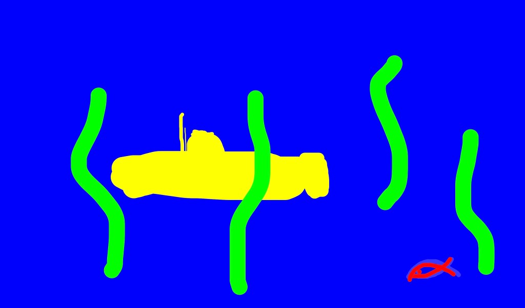I randomly drew a picture on the computer one day, using MS Paint… it was a yellow submarine, under the ocean, kelp, and a little fish. I named it “In Amongst The Kelp”