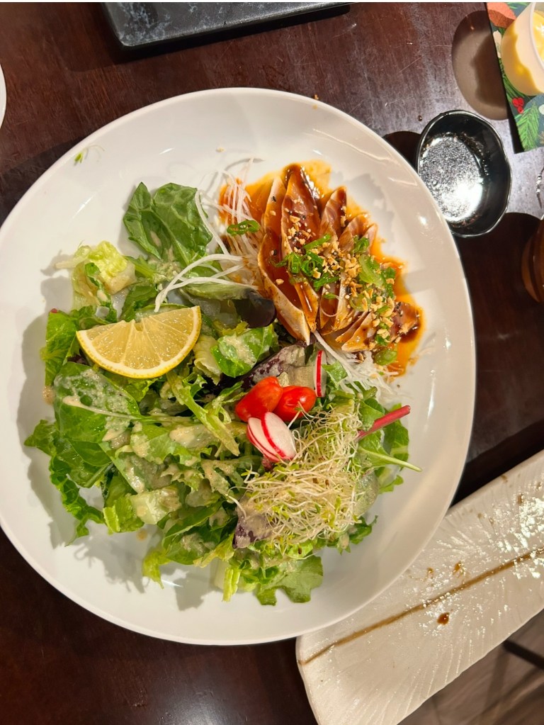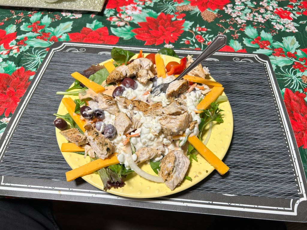 Black olives, cheddar, chicken, greens, blue cheese dressing.