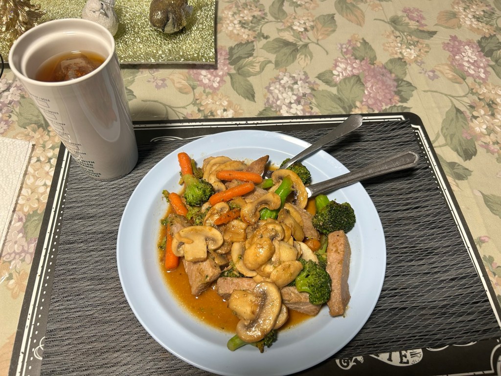 Mushrooms, broccoli, carrots; ginger, sesame oil, pepper, soy sauce