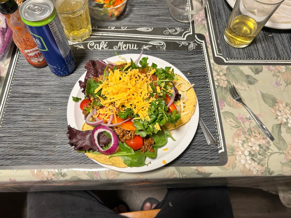 - Hamburger, ground pork, sour cream, cheese, onions, tomatoes, red and green bell peppers, greens, lettuce, black olives, cilantro