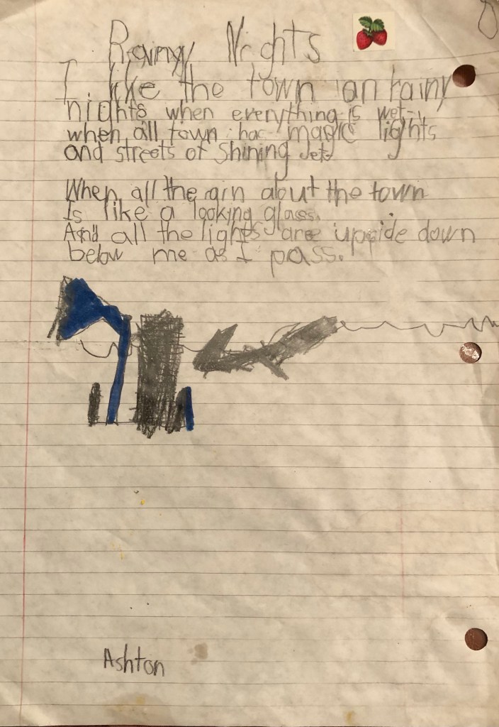 As I muse about this, the first thing that strikes me is the obvious, at least to me. Ashton, the poet, has no agenda of values that he’s trying to shove down my throat. He’s not selling anything. He’s managed to convey a picture into my mind. The juxtaposition of that beautiful picture with the reality of which he is writing is also striking. Rainy nights can be quite differently perceived.