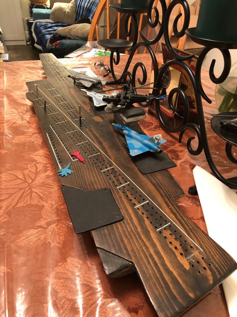 This is my cribbage board. It’s a scale model of a Nimitz class aircraft carrier. My object in building it was to make it look just enough like a carrier, without people being pissed off about me drilling holes into it LOL